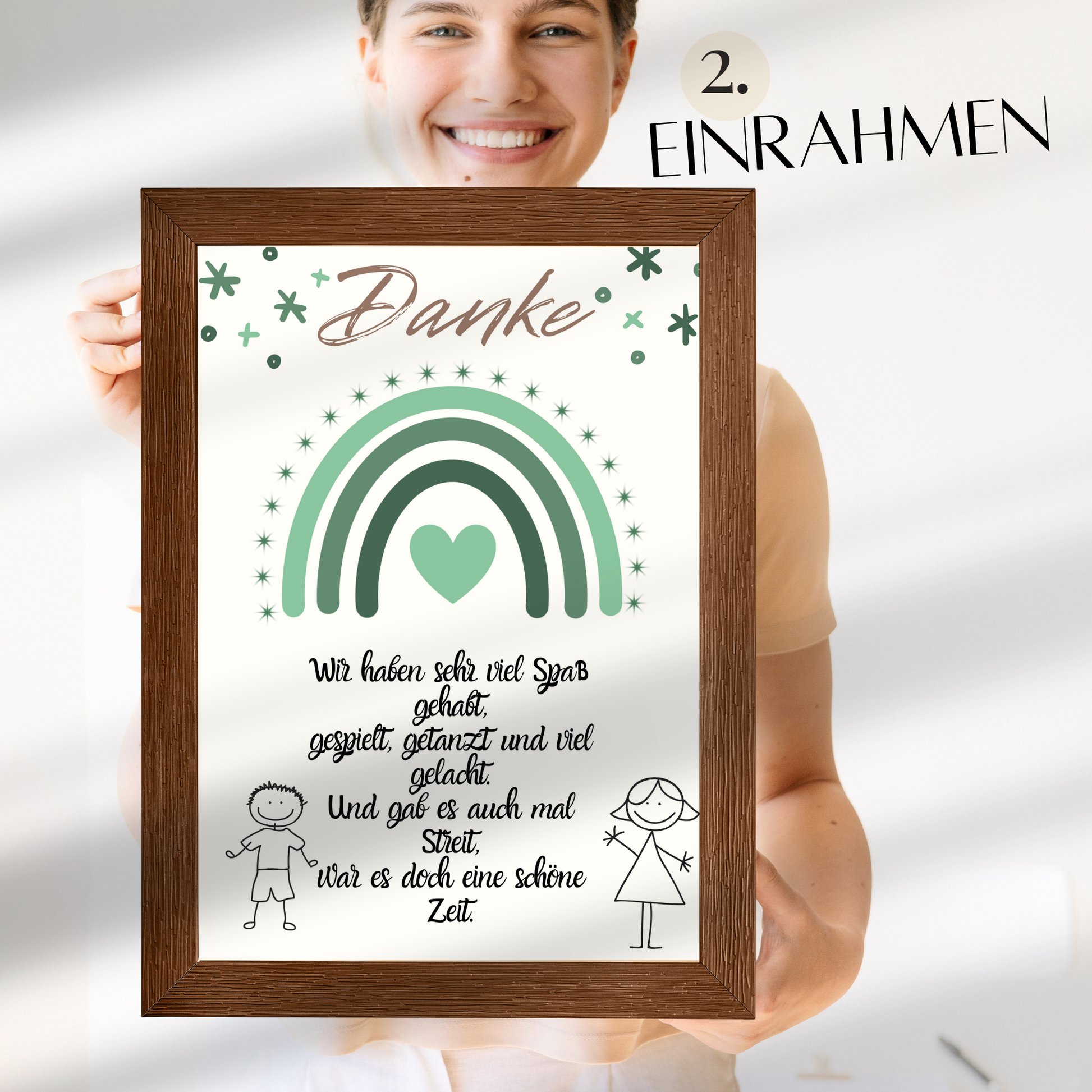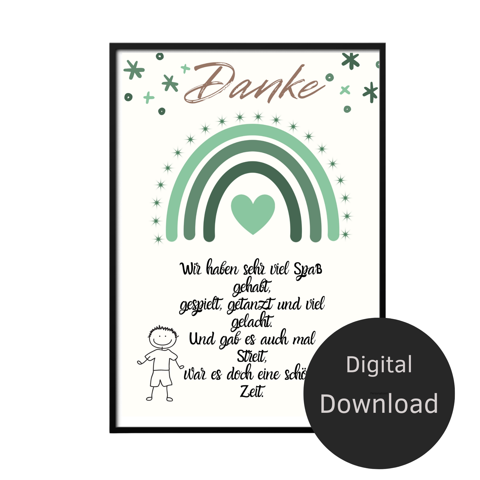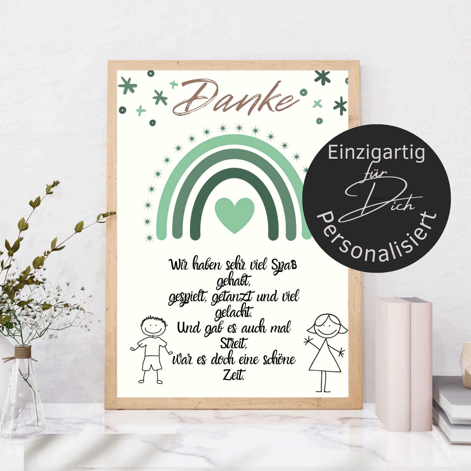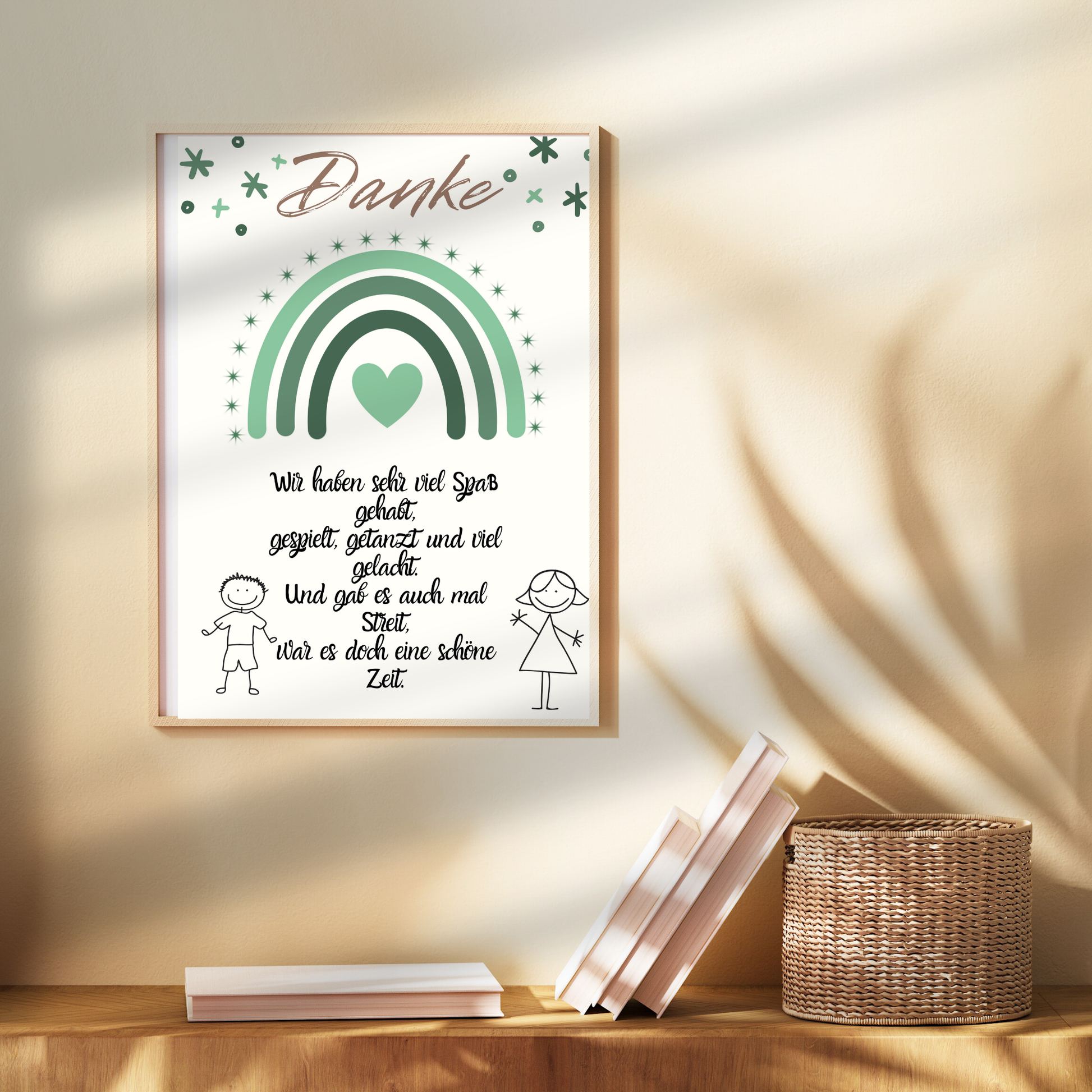 Das Poster mit grün-weißem Regenbogen, liebevoller Typografie und kindlichen Figuren transportiert auf herzliche Weise Wertschätzung und Dankbarkeit. Egal ob zum Ende der Kindergartenzeit, beim Gruppenwechsel oder zum Ruhestand – dieses Design passt zu jedem Anlass.