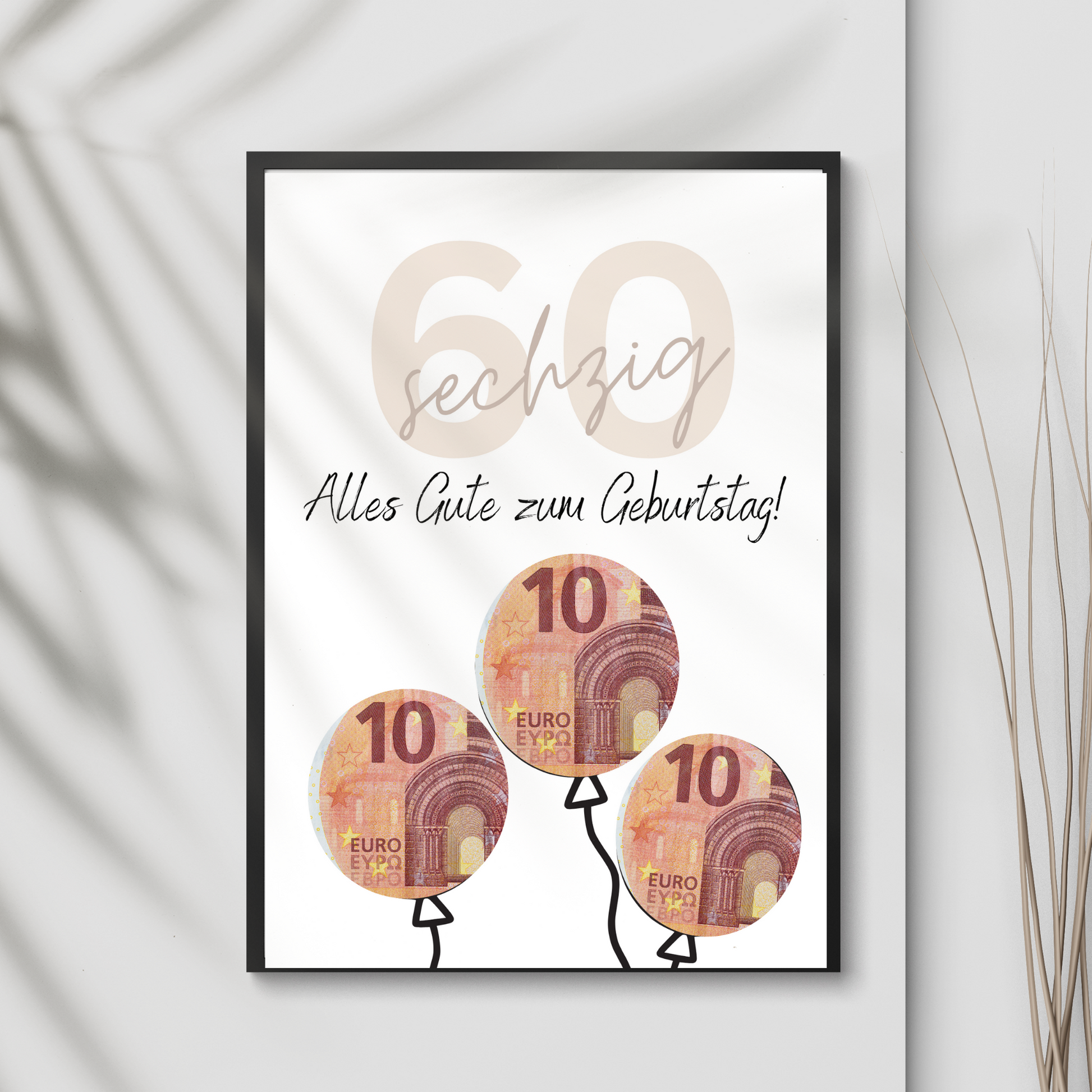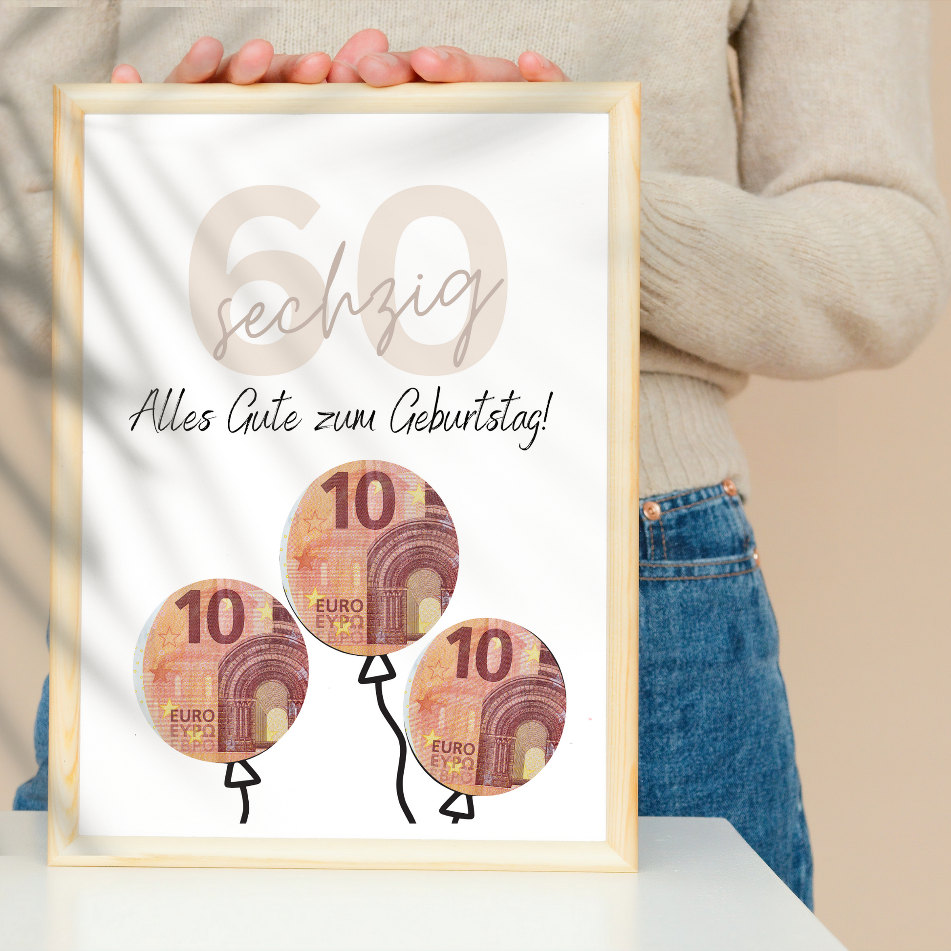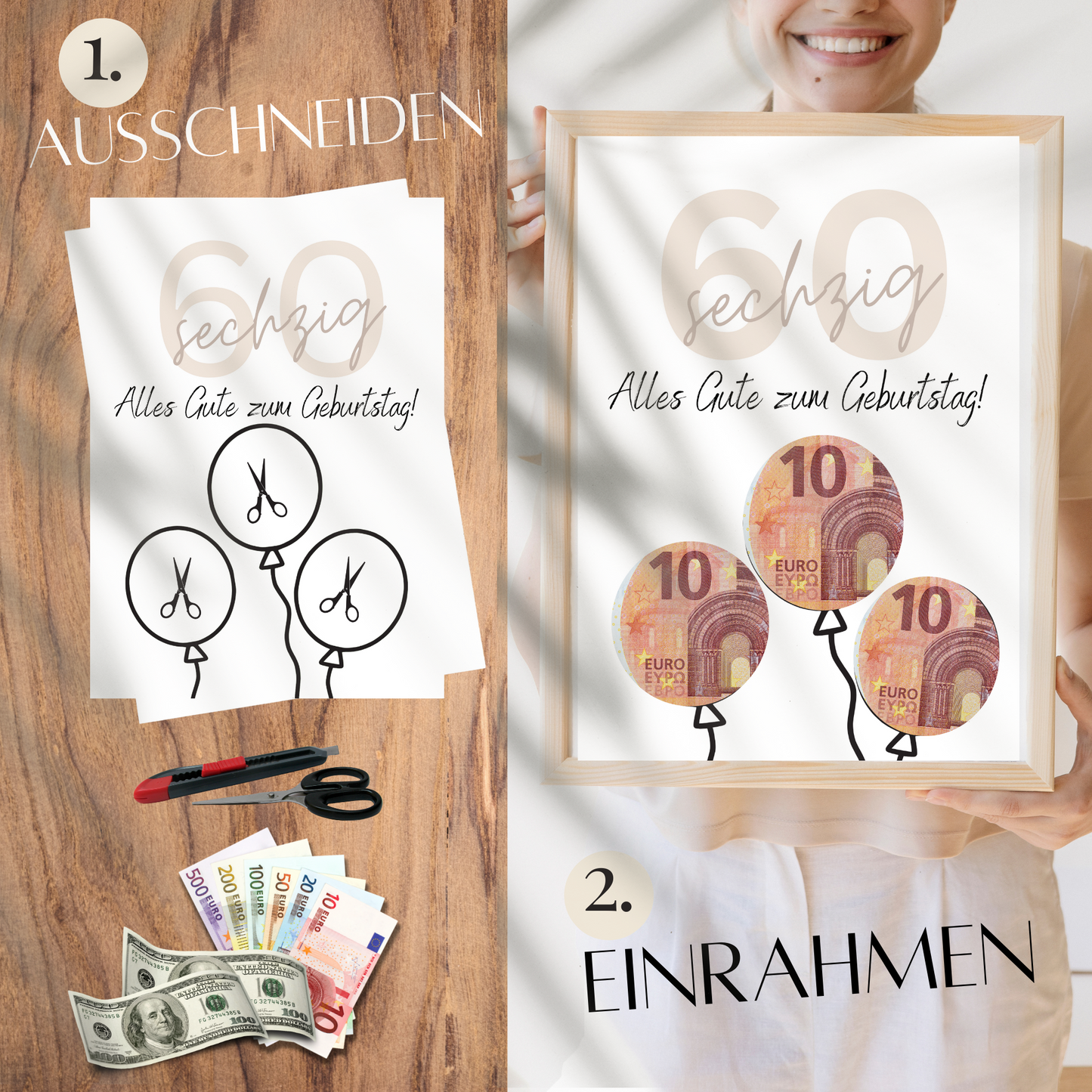 Überraschen Sie das Geburtstagskind zum 60. Geburtstag mit einem originellen und persönlichen Geldgeschenk! Diese stilvolle Vorlage zum Selbstausdrucken ist die perfekte DIY-Idee, um Geldscheine kreativ und elegant zu überreichen. Einfach die Datei herunterladen, ausdrucken, ausschneiden und hinter den Ballons die Geldscheine platzieren – anschließend nur noch in einen Bilderrahmen legen und verschenken!