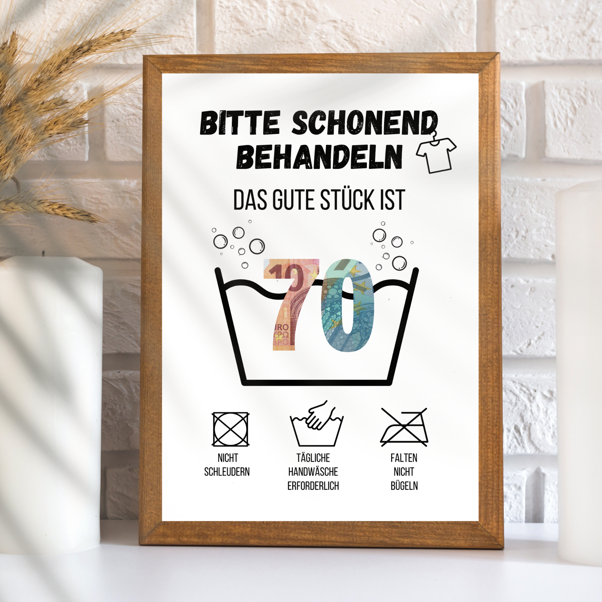 Die Gestaltung im Stil einer Wäschepflegeanleitung sorgt garantiert für Lacher und bleibt lange in Erinnerung. Einfach ausdrucken, ausschneiden und in einen Bilderrahmen legen – hinter den Zahlen „70“ lassen sich Geldscheine stilvoll und einzigartig präsentieren. So wird ein klassisches Geldgeschenk zu einer witzigen und liebevollen Aufmerksamkeit!